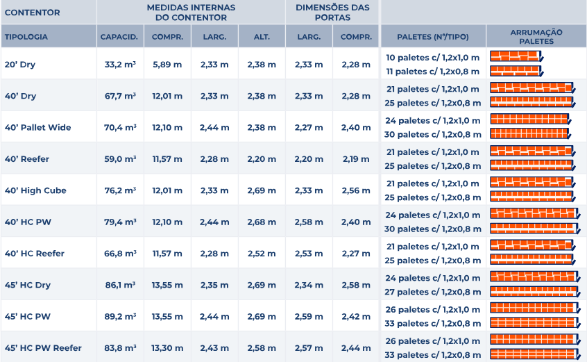 É muito importante para garantir a rentabilidade do seu transporte garantir a optimização do espaço ocupado nos equipamentos, qualquer que seja o meio de transporte utilizado. Abaixo encontrará os principais tipos de contentores usados a nível do transporte marítimo, indicando as suas dimensões base, e a melhor disposição para a carga paletizada.